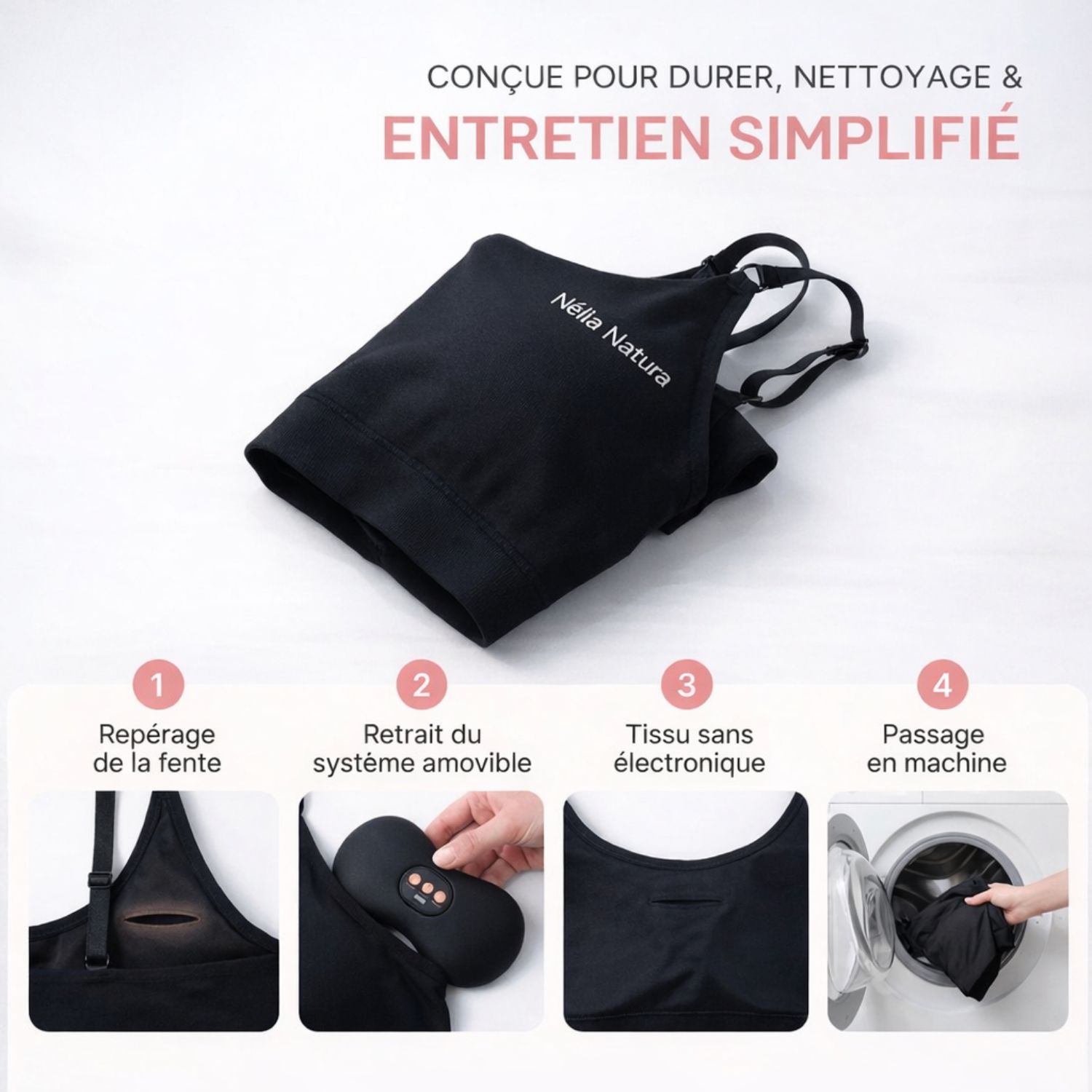 Grâce à son système amovible et son tissu sans électronique, la brassière Nélia Natura s’entretient facilement au quotidien. Retirez le module, passez-la en machine, et profitez durablement d’un confort optimisé, sans contrainte.